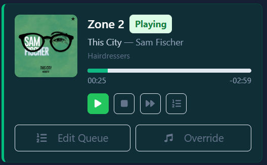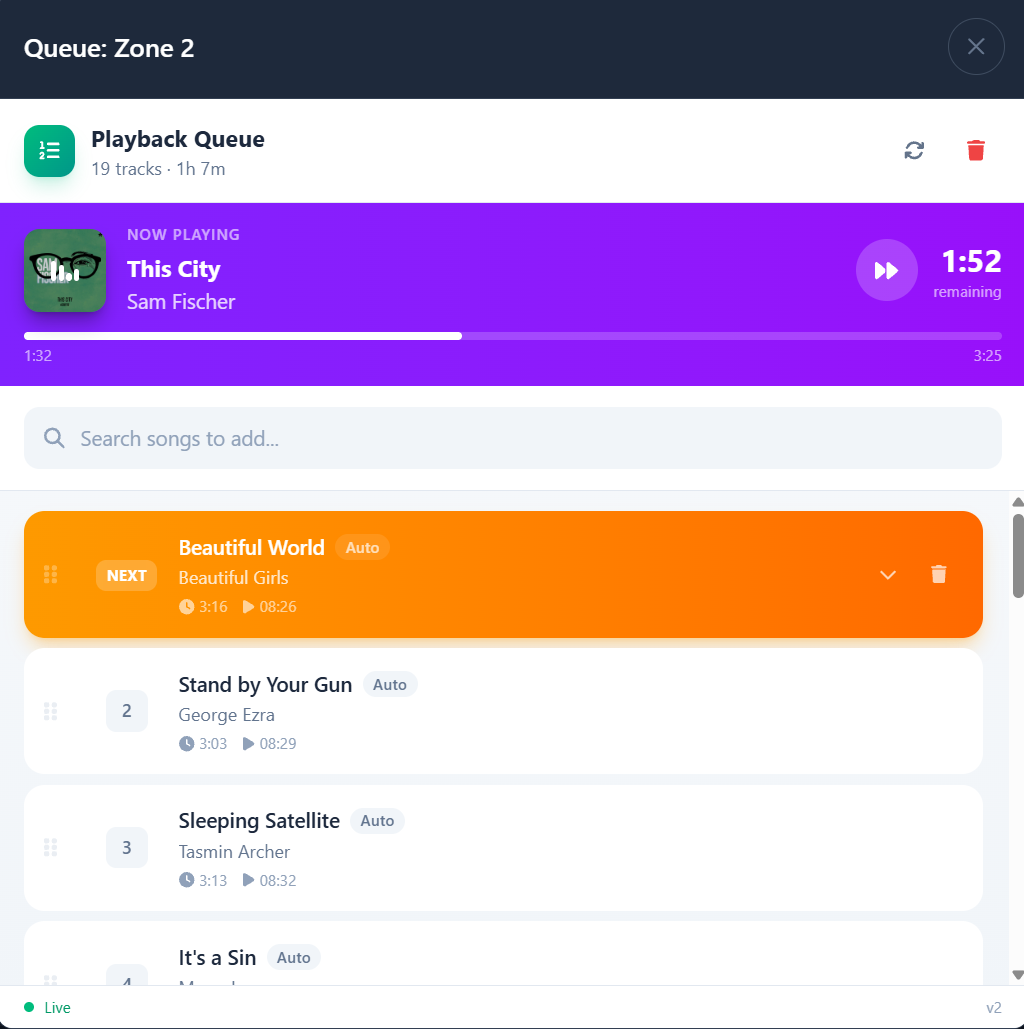 The Background Music System delivers independent audio zones from a single installation. Each zone runs its own playlist schedule, rotation logic, and volume processing. A weekly scheduler lets you assign different playlists to different times of day, with per-zone EBU R128 loudness normalisation ensuring consistent volume regardless of source material. Venue staff can override playlists and manage queues through a web interface with role-based access.