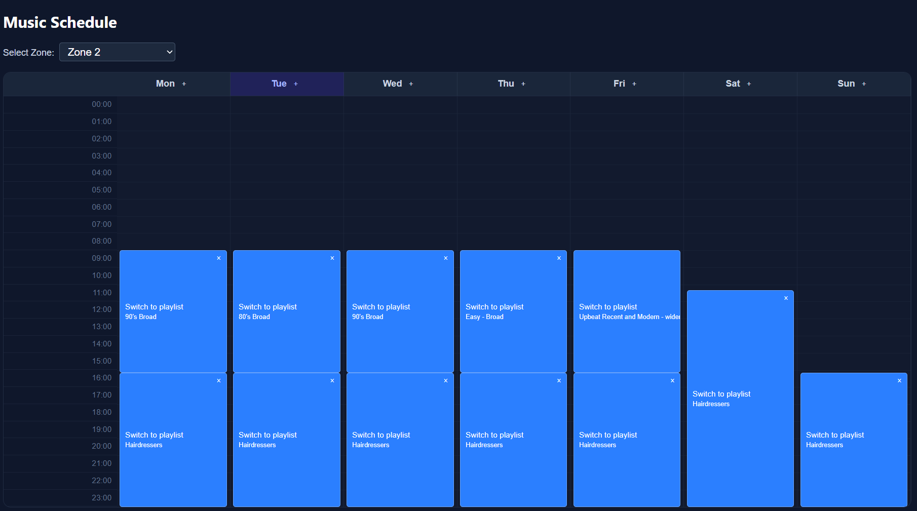 Weekly calendar scheduler assigns playlists to time blocks. Different music for morning, lunch, evening — different again for holidays.